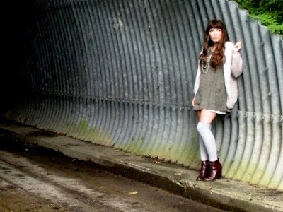 (dress: Goodwill; slipdress: UO; sweater: cedar chest; necklace: F21; crystal beads: Grammy Flood; boots: Seychelles)